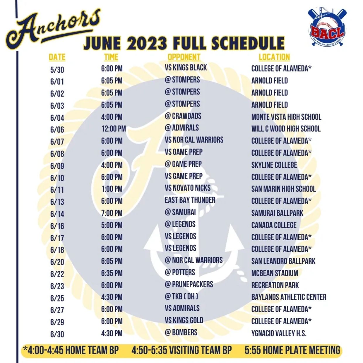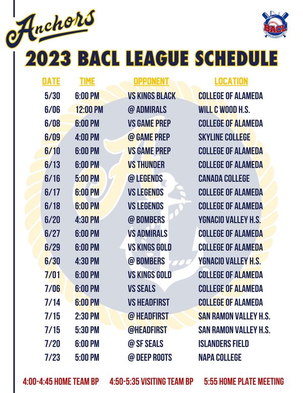 2023 - Led by Head Coach Derrick Levingston, Asst Coach Marciano Reichel, and Dustin Cheyne. The first ever Alameda Anchors team got the party started with our first BACL Championship!!! This team was loaded with talent up an down the roster!